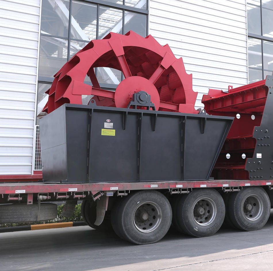 工作時,動力裝置通過三角帶、減速機、齒輪減速后帶動葉輪緩慢轉動,砂石由給料槽進入洗槽中完成清洗作用。干凈的砂石由葉片帶走,砂石從旋轉的葉輪倒入出料槽,完成砂石的清洗作用。