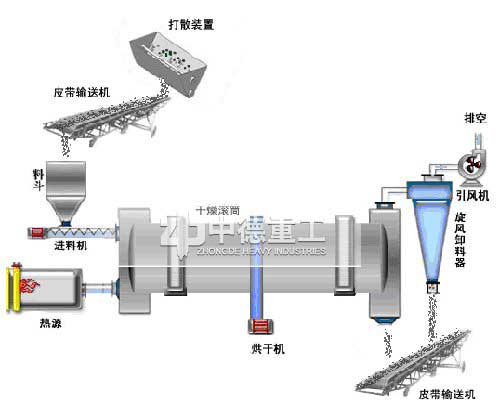 沙子由皮帶輸送機或斗式提升機送到料斗,然后經(jīng)料斗的加料機通過加料管道進入加料端,加料管道的斜度要大于物料的自然傾角,以便物料順利流入干燥器內(nèi),烘干機的滾筒是一個與水平線略成傾斜的旋轉圓筒,河沙等物料從較高一端加入,載熱體由低端進入,與物料成逆流接觸,也有載熱體和物料一起并流進入筒體的。隨著圓筒的轉動物料受重力作用運行到較底的一端,濕物料在筒體內(nèi)向前移動過程中,直接或間接得到了載熱體的給熱,使?jié)裎锪系靡院娓?,然后在出料端?jīng)皮帶輸送機送出。在轉筒內(nèi)壁上還裝有揚料板,主要是在轉筒滾動中將物料抄起再撒下,由此使?jié)窳喜灰渍辰Y,充分與氣流接觸,得到效率高烘干。