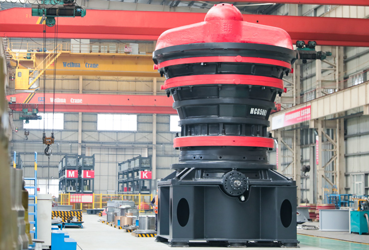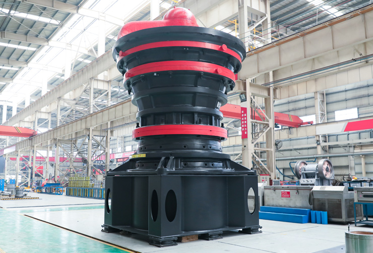 旋回式破碎機(jī)主要由橫梁部、上中下機(jī)架部、動(dòng)錐部、偏心套部、傳動(dòng)部和液壓缸部等組成。在設(shè)備工作時(shí),由電動(dòng)機(jī)帶動(dòng)水平軸旋轉(zhuǎn),水平軸通過齒輪帶動(dòng)偏心套旋轉(zhuǎn),再由偏心套帶動(dòng)動(dòng)錐部做圓周擺動(dòng),從而實(shí)現(xiàn)連續(xù)的擠壓破碎石塊??赏ㄟ^調(diào)節(jié)動(dòng)錐底部的液壓缸改變排礦口的大小,方便調(diào)整產(chǎn)品粒度;同時(shí)液壓缸也提供過鐵保護(hù)功能,當(dāng)有不能破碎的物體進(jìn)入破碎腔時(shí),液壓缸能自動(dòng)使動(dòng)錐下落釋放物體,保護(hù)破碎腔。